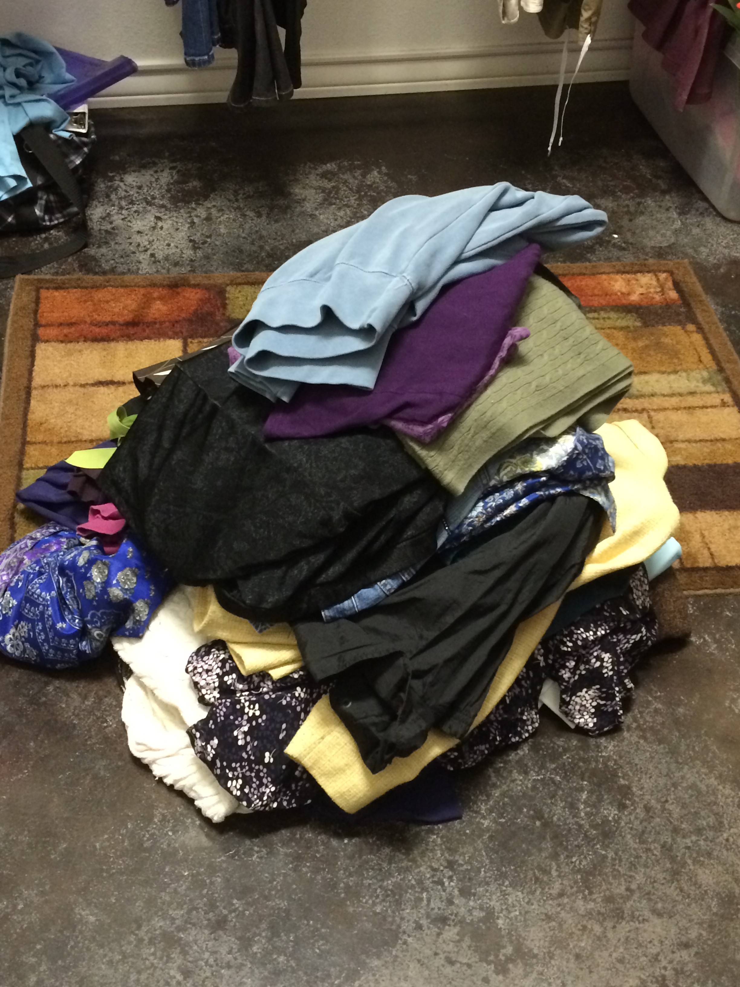 Cyndi worked on her closet this week. The reason I know what she did is because she has a pile of clothes in the middle of the floor two feet high and three feet in diameter. And the reason I know about the pile on her closet floor (we have separate closets, one of my three requests when we built this house (the other two requests: no lawn to mow, and a library)) is because walking through her closet is the most direct route to the laundry room and I had to negotiate my way around the pile without dropping a basket full of clothes and adding to her pile.