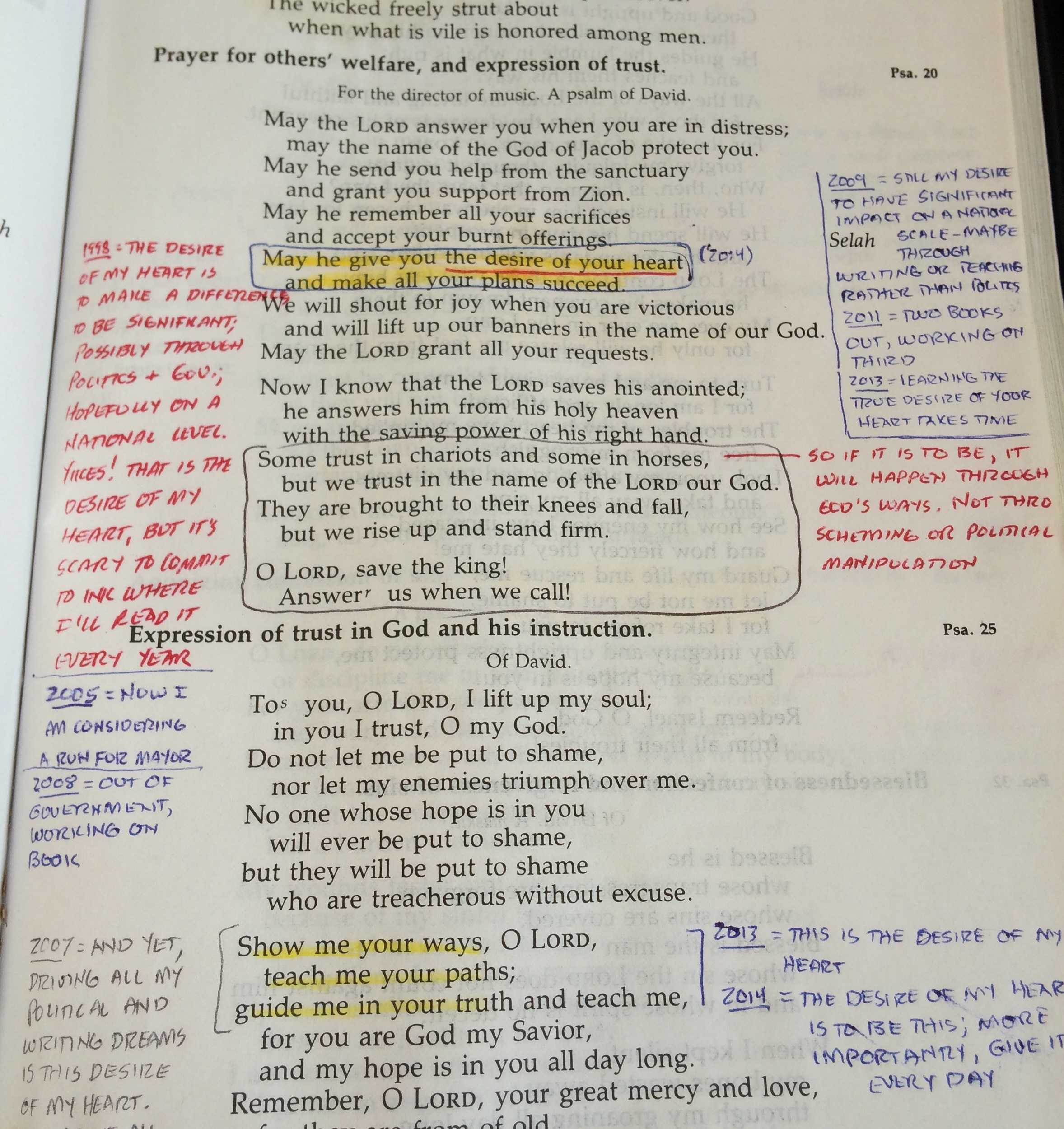 On the same page of my Daily Bible, about two inches lower, is Psalm 25. “Show me your ways, O Lord, teach me your paths; guide me in your truth and teach me.” In 2013 I wrote in the margin: “This is the desire of my heart.”