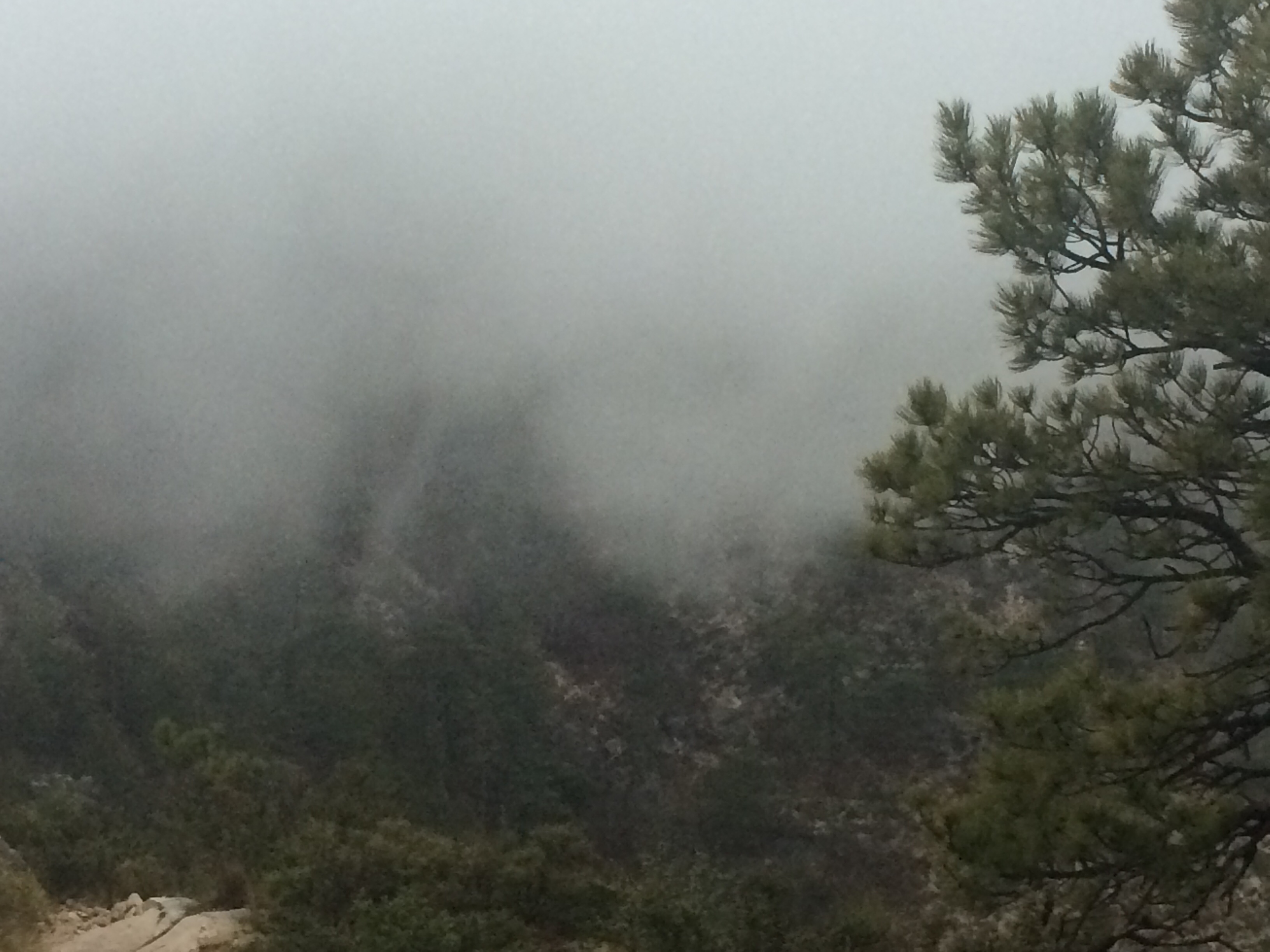 As it turned out, we hiked in the cold rain almost the entire day. It was 60* with drizzle in the parking lot when we started up the trail, and the rain increased and temperature dropped all the way up the mountain. At the summit the temperature was about 40*, the wind was frightening, and the rain clouds had morphed into thunder and lightning. No one spent much time at the summit since Guadalupe Peak is, essentially, a lightning rod for the entire state of Texas.